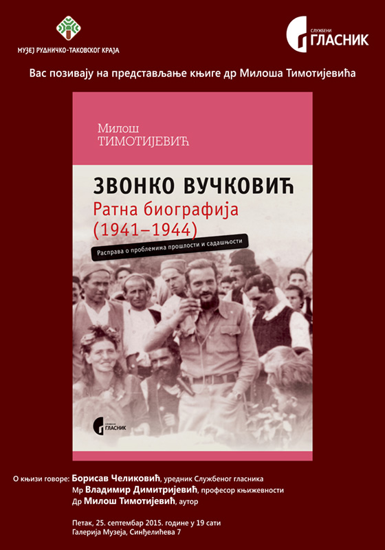У петак, 25. септембра 2015. године у 19 сати, у галерији Музеја рудничко-таковског краја, биће представљена историјска студија Звонко Вучковић: Ратна биографија (1941-1944), расправа о проблемима прошлости и садашњости у издању Службеног гласника из Београда.