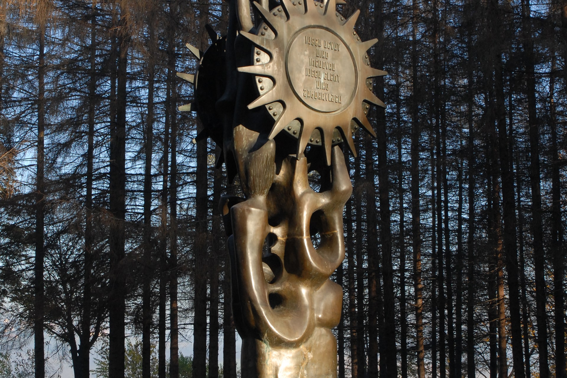 Following that, year after year until the present day, the Hill of Peace got new monuments – memorial marks, which often represented the tragic history of this region. To commemorate 3,000 killed and deceased concentration camp prisoners from the then Yugoslavia captured by Germans, a Monument to internees in Norway was made in 1973. The sculpture, which was a work of art of a sculptor Živorad Žika Maksimović from Čačak, symbolises a camp with barbed wire where many died a martyr’s death, as well as a tree of life and death growing from human bones on a grindstone. The monument is placed on a burial mound, where one can find a rectangular base of black marble with a carved coat of arms at the front. There is a marble pedestal on the base in the shape of a grindstone where bronze part of the monument is rising with a couple of thorny spears on the top. The middle part of the monument has a Viking shield and a sun, together with texts written in both Serbian and Norwegian language: No one named, no one forgotten. On the other shield (on the opposite side), there are the following lines: No! No one should be sad over our graves. With the sound of avalanches, at the place where the cold weather reigns, may only the whirlwind circle above the dead in the polar night that gloomily wears on. In front of the monument, two plates are placed: the first bronze one with an explanation that the monument is put up to honour those who died in 24 Nazi camps in Norway – from Bergen to Karasjok – between 1941 and 1945. The other colourful marble plate provides the information that a lump of Norwegian soil is put under the monument. Six polar juniper trees, which were brought from the same area, were planted around the monument.