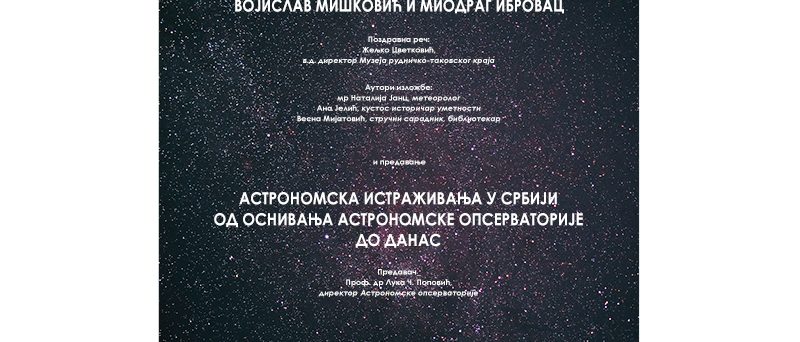 Као допринос развоју српске астрономије и Астрономске опсерваторије у њених 137 година трајања и 100 година њене институцијалне самосталности, у Галерији музеја, 14. новембра са почетком у 18 часова биће отворена изложба “ Путовање међу звездама -Војислав Мишковић и Миодраг Ибровац“ аутора мр Наталије Јанц, метеоролога, Ане Јелић, кустоса историчара уметности и Весне Мијатовић, стручног саветника, библиотекара. Том приликом ће бити уприличено предавање проф. др Луке Ч. Поповића, директора Астрономске опсерваторије у Београду на тему „Астрономске опсерваторије до данас“.